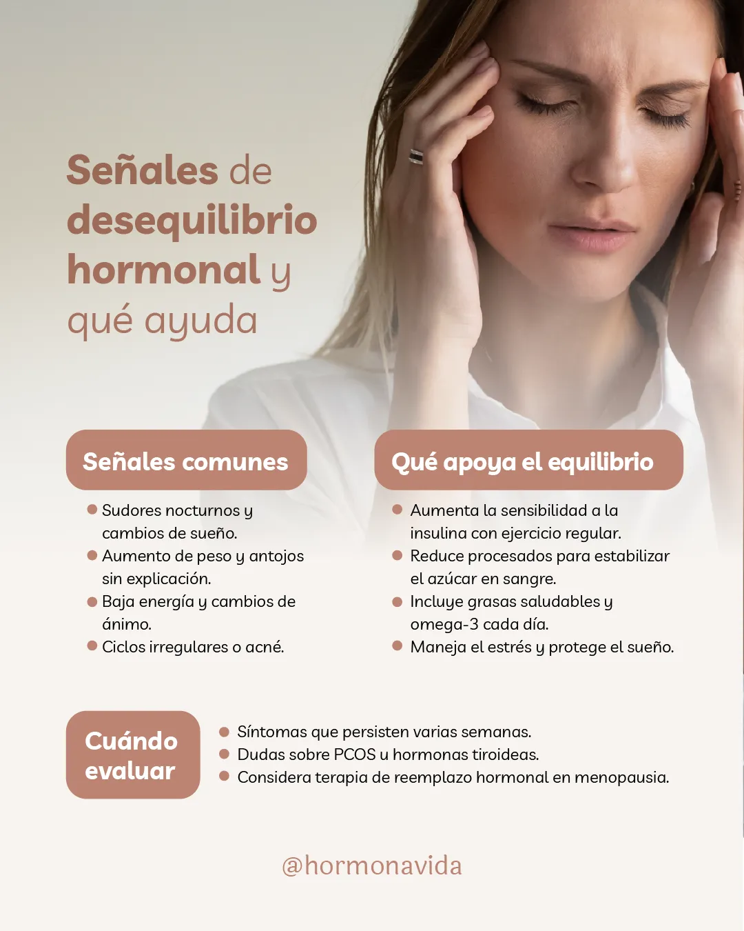 A veces, sentirte “desbalanceada” se nota poco. Otras veces, se nota demasiado. Puedes notar fatiga, irritabilidad o aumento de peso. También puedes notar sudores nocturnos o cambios en el sueño. Estos pueden ser señales de desequilibrio hormonal.